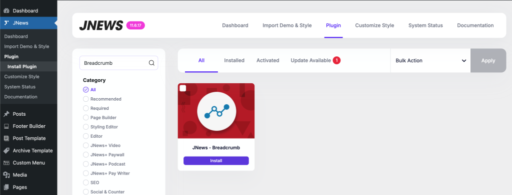 To use JNews Breadcrumb plugin, you can easily install and activate this plugin from Plugin Dashboard by going to JNews → Plugin → Install Plugin