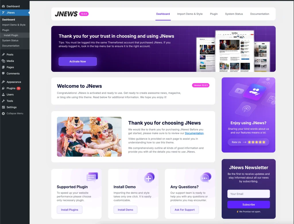 Right after finishing JNews activation, please activate your theme license to receive all benefits from JNews such as theme updates, import content & style, and unlock all other features.