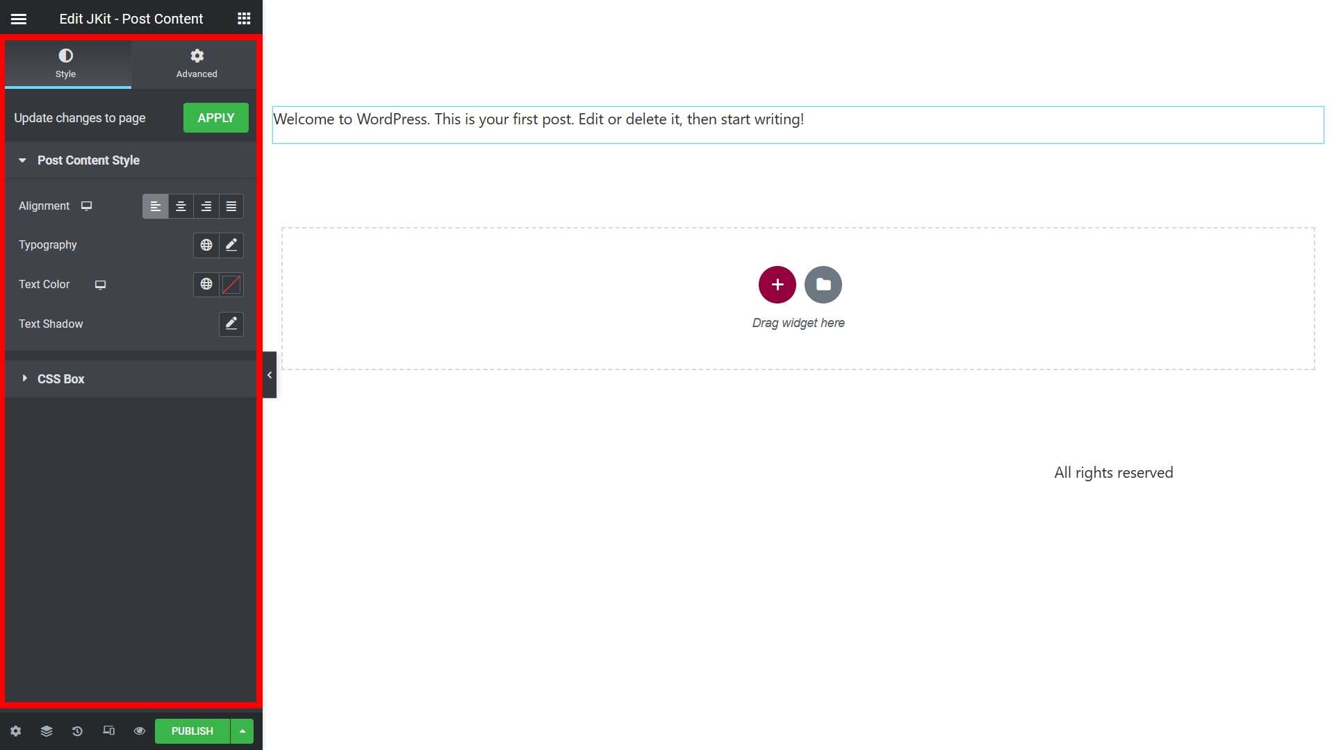 To add JKit Post Content to your page, you can open Elementor on your page, and search for “JKit – Post Content” in the sidebar.