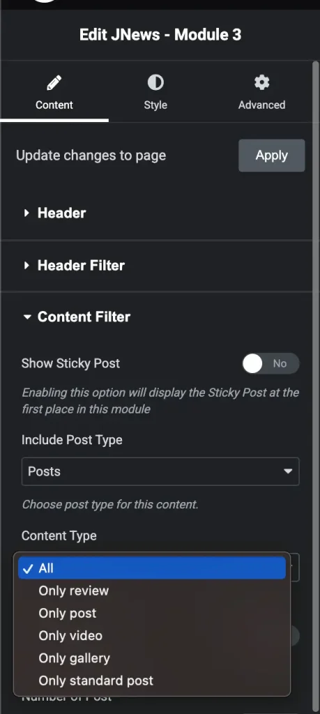 In JNews, elements used to display a list of posts such as JNews – Module, JNews – Hero, JNews – Slider, JNews Carousel, and JNews – News Ticker have a Content Filter feature.